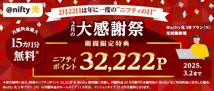 ニフティ、「2月の大感謝祭」として「ニフ(22)ティ」にちなみ「@nifty光 3年プラン(N)」の新規申込でもらえるニフティポイントを2,222ポイント増額