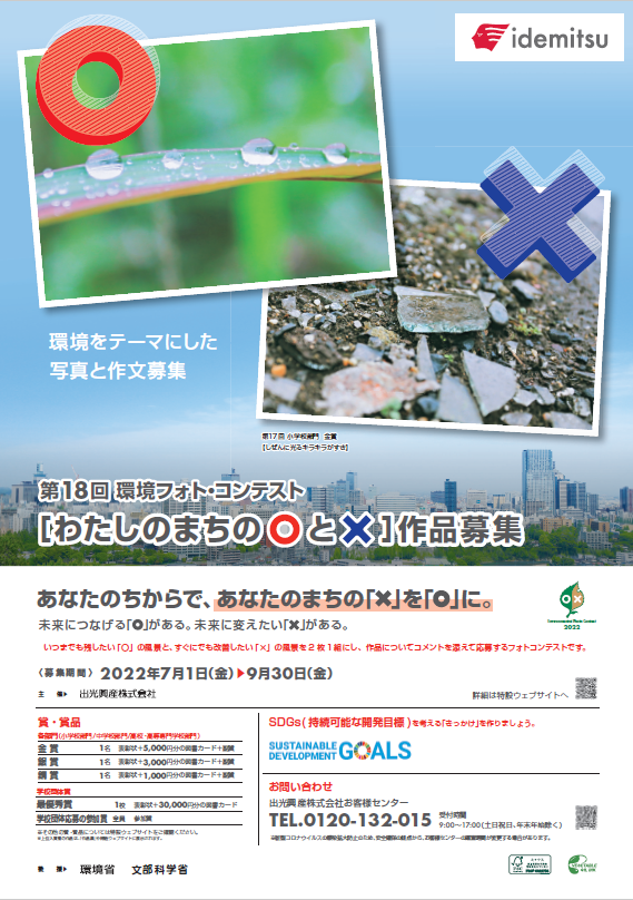 出光興産株式会社(本社:東京都千代田区、代表取締役社長:木藤 俊一)は、次世代育成と環境に関わる社会貢献活動の一環として、児童・生徒を対象とする第18回環境フォト・コンテスト「わたしのまちの○(まる)と×(ばつ)」を実施、7月1日から作品募集を開始します。