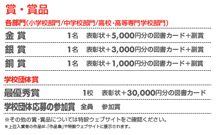 賞・賞品 : 小学校部門、中学校部門、高校・高等専門学校部門の各賞および学校団体賞