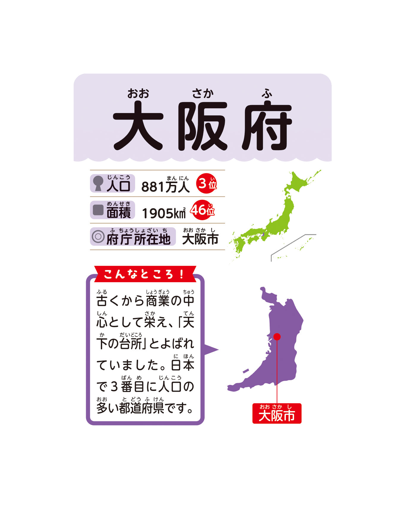 ・裏面は各都道府県の人口・面積・都道府県庁所在地・「こんなところ!」など、基本情報を掲載。