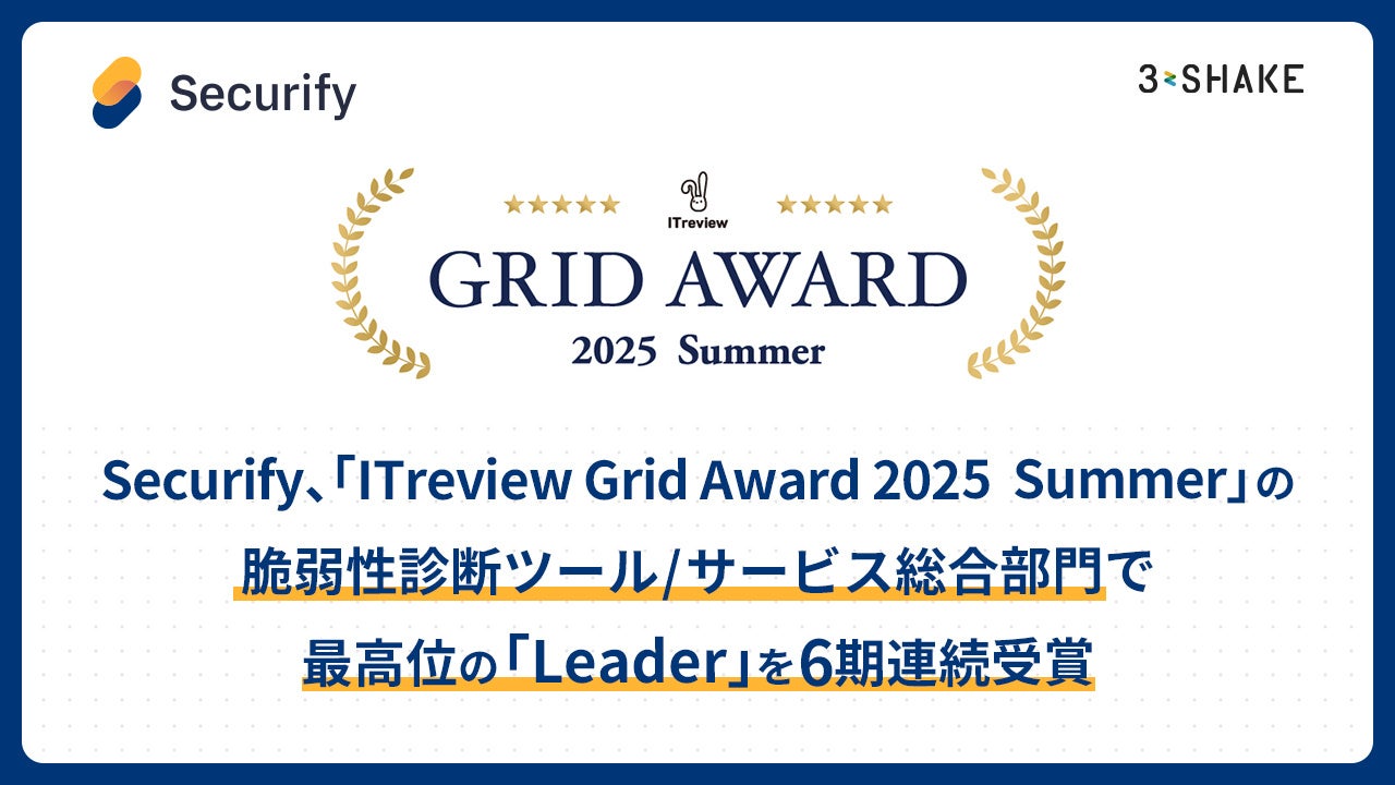 株式会社スリーシェイク(本社:東京都新宿区、代表取締役社長:吉田 拓真、以下スリーシェイク)が提供する、統合セキュリティプラットフォーム「 Securify(セキュリファイ)」は、IT製品レビュープラットフォーム 「ITreview(アイティレビュー)」 において顧客満足度・製品認知度ともに優れた製品であると評価され、 「ITreview Grid Award 2025 Summer」 の脆弱性診断ツール/サービス総合部門、中堅企業部門と中小企業部門の3部門において最高位の 「Leader」 を受賞したことをお知らせします。なお、今夏の受賞で、脆弱性診断ツール/サービス総合部門ではLeaderを6期連続、中堅企業部門と中小企業部門ではLeaderを5期連続受賞となります。