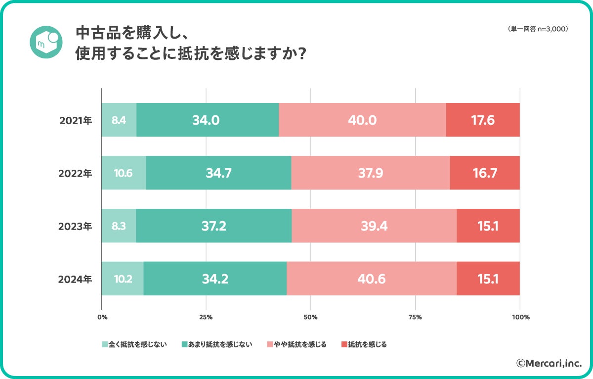 中古品を購入し、使用することに抵抗を感じるか質問したところ、全体で55.7%が「抵抗を感じる」もしくは「やや抵抗を感じる」と回答しました。過去3年間の結果と比較しても、大きな変化はありませんでした。