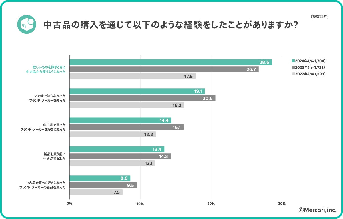 中古品の購入を通じて、「欲しいものを探すときに中古品から探すようになった」人が増加。また、中古品が新たなブランド・メーカーとの出会いのきっかけに