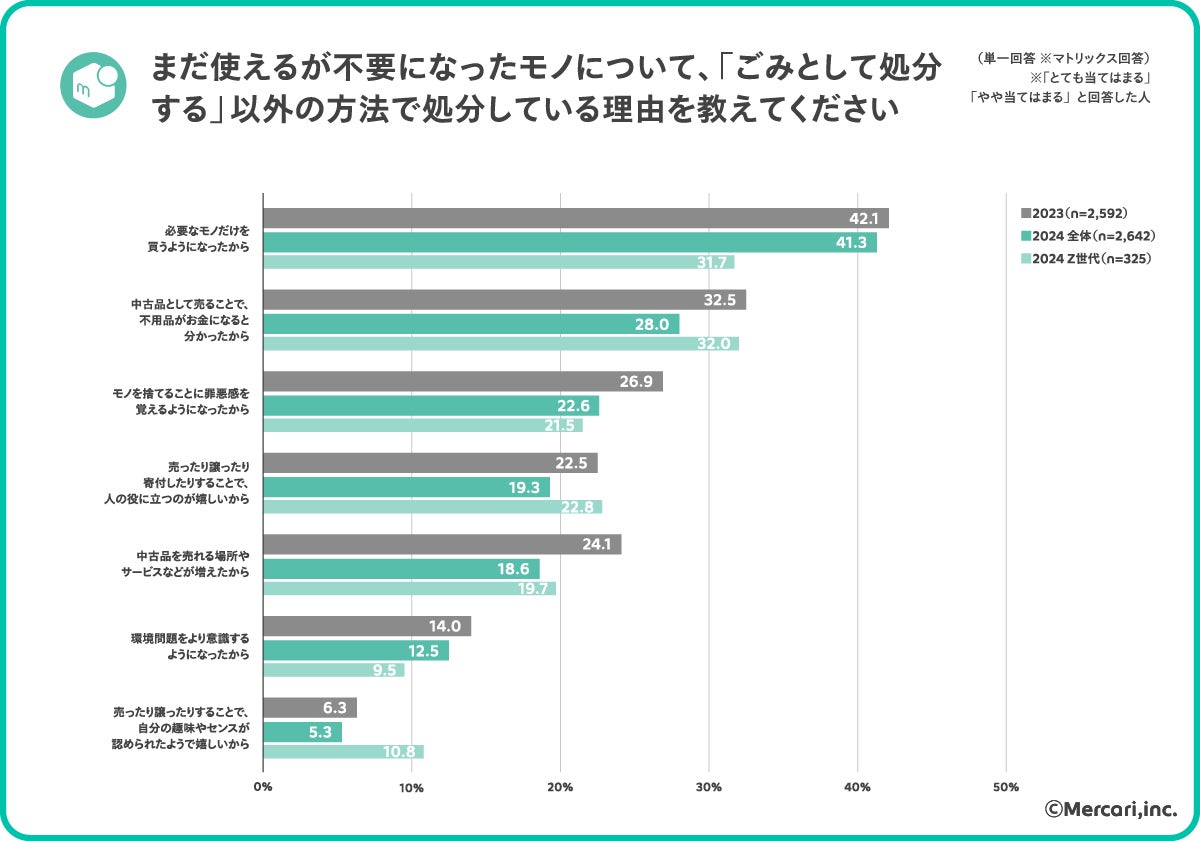 まだ使えるが不要になったモノを「ごみとして処分する」以外の方法で処分している理由について質問したところ、全体では「必要なモノだけを買うようになったから(処分するモノが減った)」が41.3%と最も多く、次いで「中古品として売ることで、不要品がお金になると分かったから」(28.0%)、「モノを捨てることに罪悪感を覚えるようになったから」(22.6%)となりました。