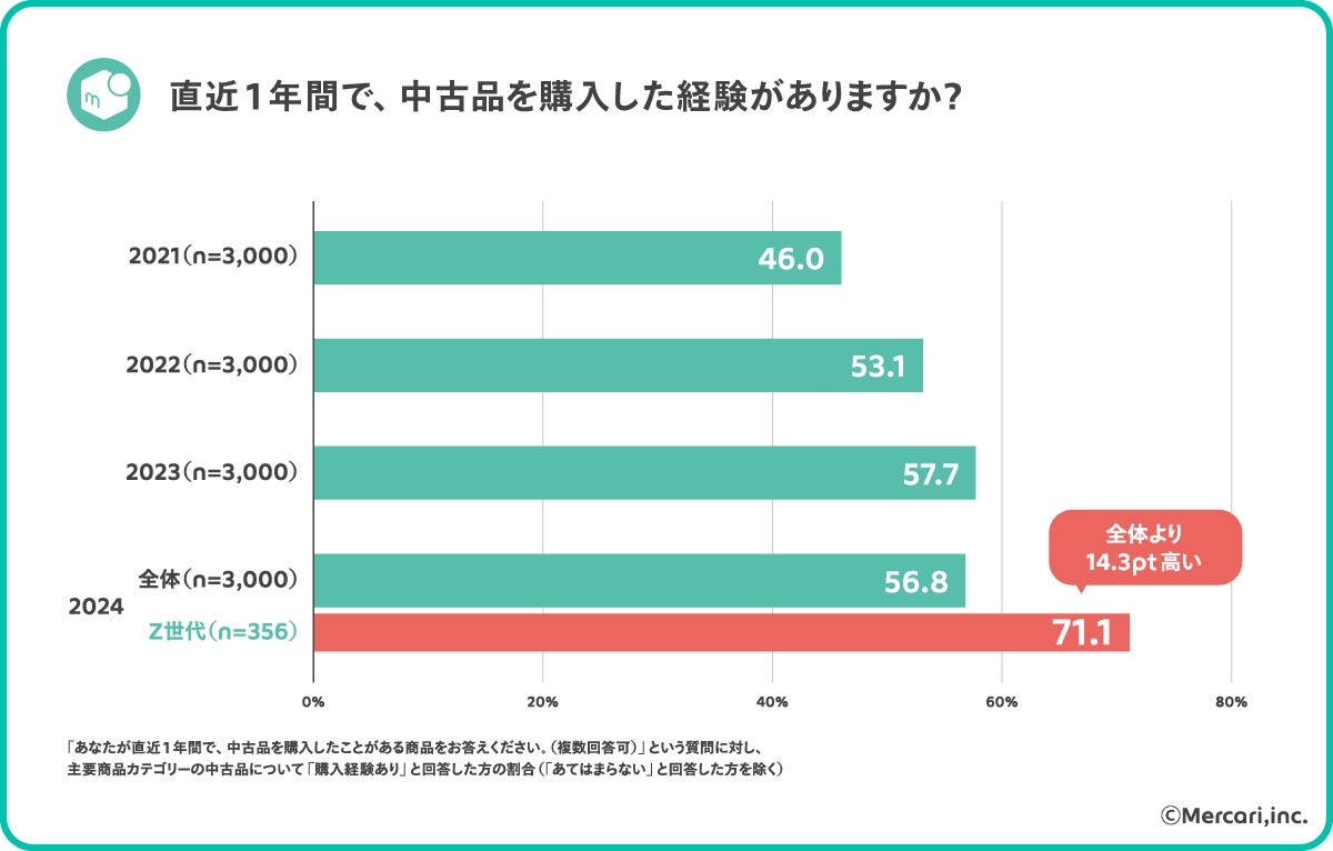 直近1年間で、中古品を購入したことがあると回答した人は、全体では56.8%で、経年では微減となりました。一方で、Z世代は71.1%が購入したことがあると回答し、全体より14.3pt高いことがわかりました。