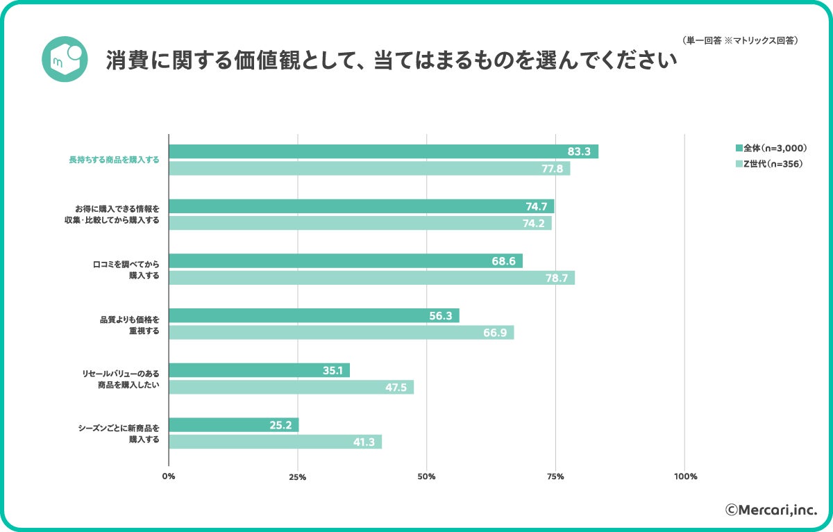 まず、消費に関する価値観として「あてはまる」ものをたずねたところ、「長持ちする商品を購入する」が全体で83.3%と最も高く、「お得に購入できる情報を収集・比較してから購入する」(74.7%)、「口コミを調べてから購入する」(68.6%)と続きました。