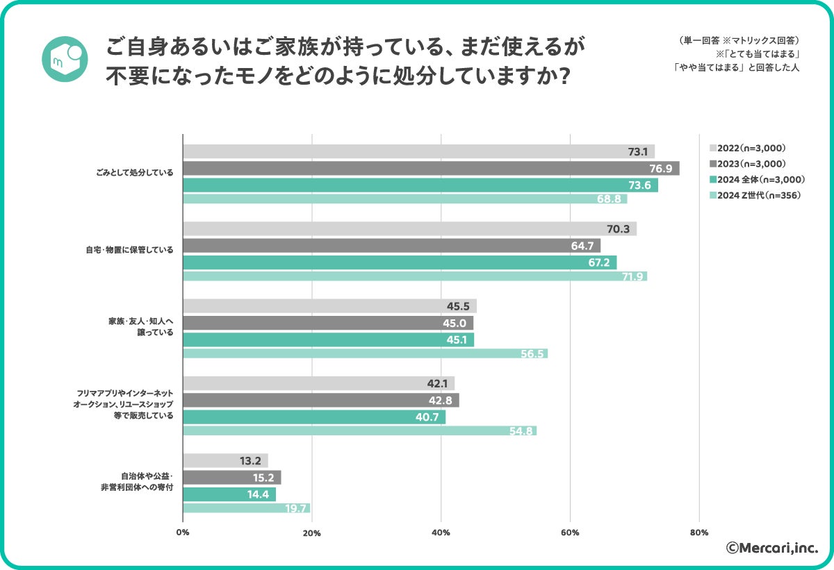 まだ使えるが不要になったモノについてどのように処分しているかたずねたところ、「ごみとして処分している」が73.6%と依然として最も多いことがわかりました。一方で、Z世代は「家族・友人・知人へ譲っている」(56.5%)、「フリマアプリやインターネットオークション、リユースショップ等で販売している」(54.8%)が全体と比べて10pt以上高いことがわかりました。