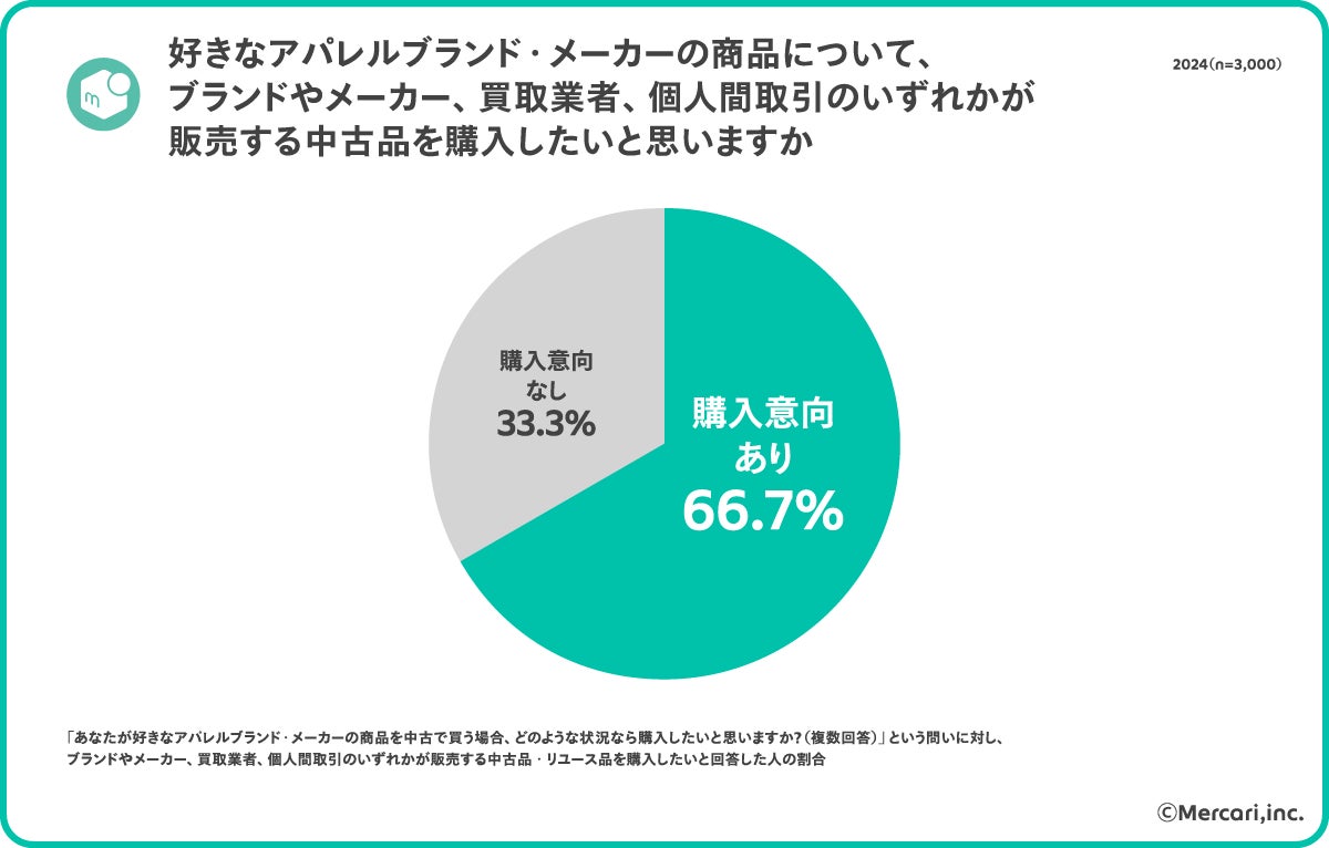 一方で、好きなアパレルブランド・メーカーの商品を中古品で購入したいと思うか質問したところ、66.7%がブランド・メーカーの公式販売、買取業者の販売、個人間取引での出品など、いずれかの状況で購入したいと回答しました。