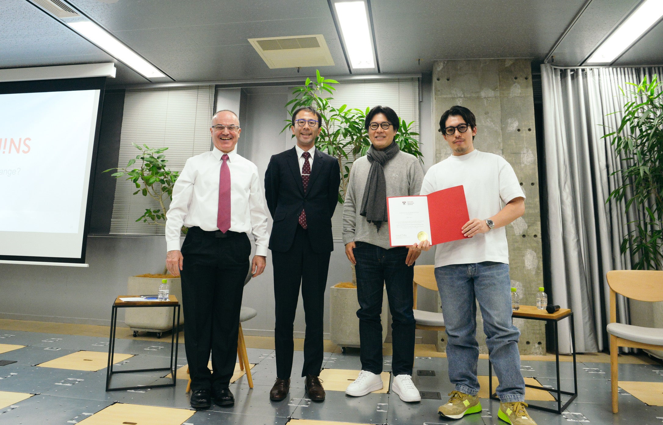株式会社ジンズホールディングス(以下JINS)は、米国ハーバード・ビジネス・スクール(以下HBS)が実施する、世界各地のビジネスの現場を学ぶ短期フィールドプログラム「Immersive Field Course」(以下IFC)の日本プログラム「JAPAN IFC」において、MBA2年生に体験学習の機会を提供しました。「JAPAN IFC」はビジネスの現場を実践的に学ぶもので、JINSは日本発のグローバルブランドへの成長や独自のイノベーションによる市場の創造などを対談形式で紹介しました。