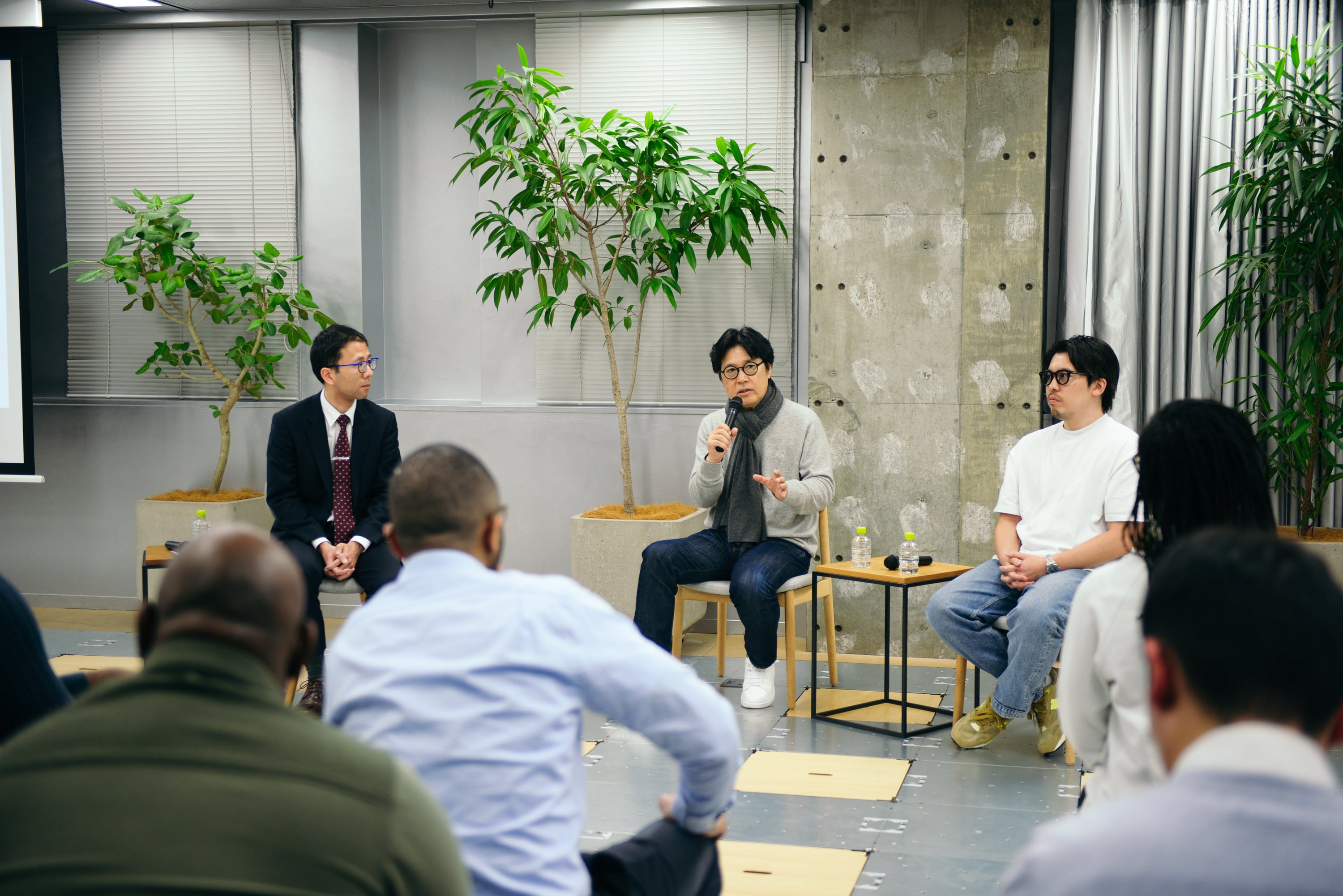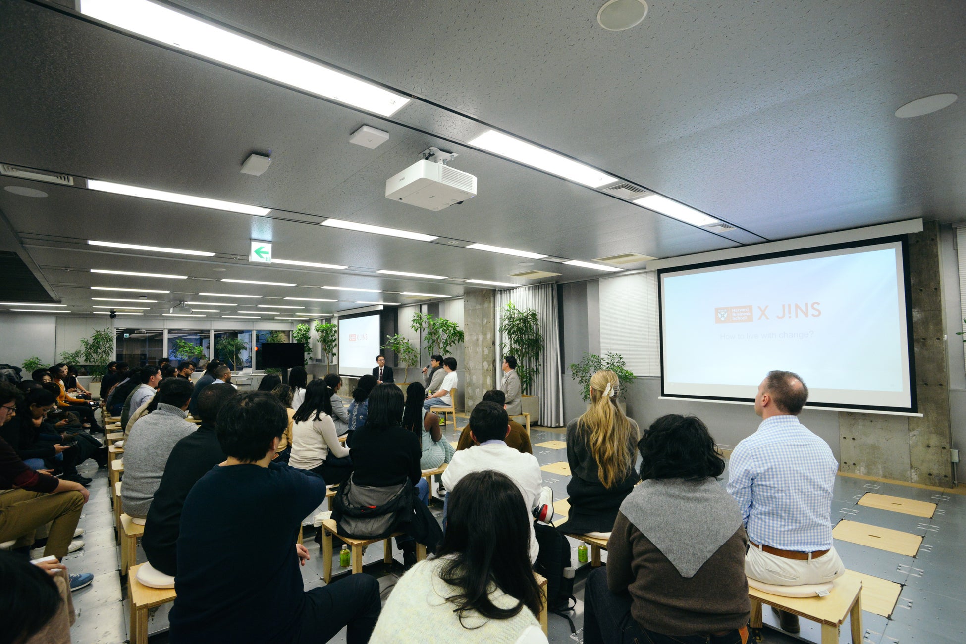 当日は、「JAPAN IFC」を担当する天野友道氏(ハーバード・ビジネス・スクール助教授)と田中仁(ジンズホールディングス代表取締役会長CEO)、田中亮(ジンズホールディングス代表取締役社長COO)が対談。日本企業の長期志向、市場変化への対応やリスクテイクとの両立、新しい価値を生み出し続ける源泉、グローバル展開における変革など、学生がJINSに関心を寄せるテーマに沿って展開。世界中から集まった45名のMBA学生との対話は、JINSが培ってきたイノベーションの価値を再発見する機会となりました。