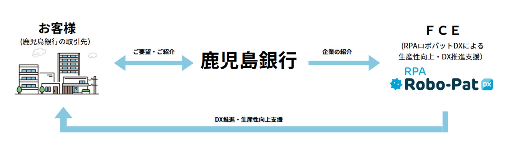 本業務提携により、鹿児島銀行はFCEが提供する「RPAロボパットDX」を中小企業に紹介し、企業の業務効率化や生産性向上の取り組みを支援していきます。