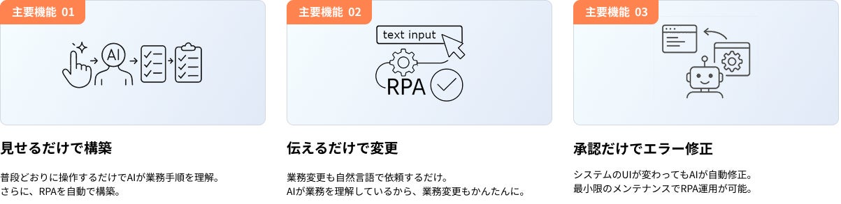 自動化したい業務を人が普段通りに操作することでAIに学習させ、自動でRPAを構築できます。