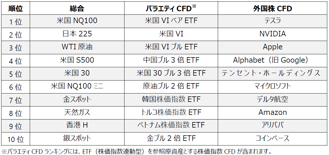~総合首位は米国NQ100!バラエティCFDでは米国VIベアETF、外国株CFDではテスラが首位に~