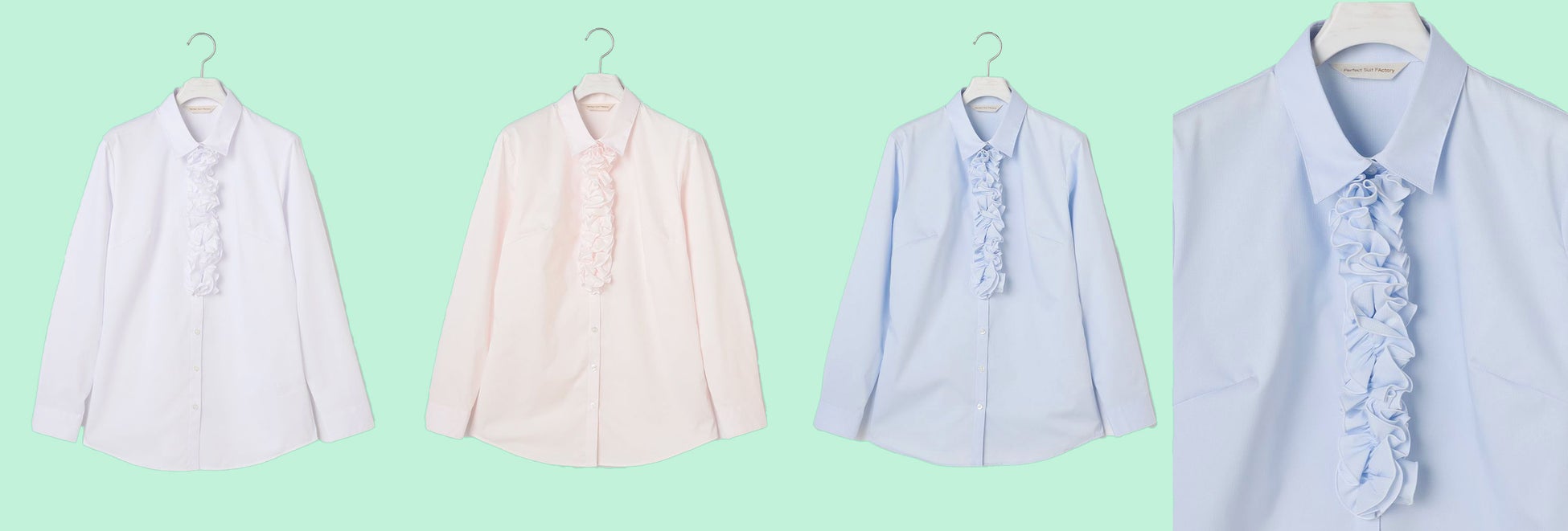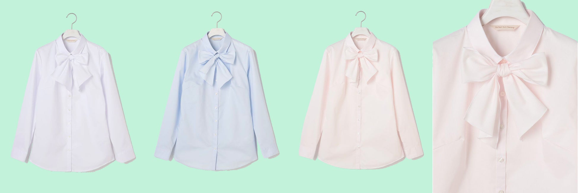 新入学を迎えるレディスフレッシャーズの方に人気のデザインブラウスシリーズが今年も登場いたしました。P.S.FAでファーストスーツをお買い物いただくフレッシャーズのお客様の約7割の方がリボン、フリルが付いたデザインブラウスをお選びいただいていること※を受け、今年は新たに大人キレイなスタイルが叶う『4WAYボウタイブラウス』を追加した全3デザインでご用意いたしました。