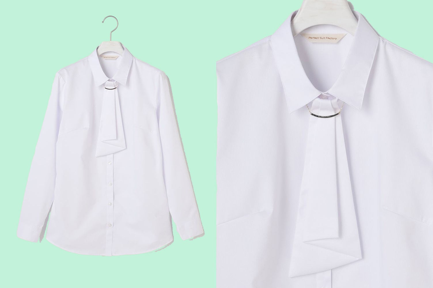 今季から登場する新デザインです。ボウタイ×バーパーツ仕様で大人っぽさを演出、パンツスタイルとも合わせやすいキレイめデザインが新鮮です。すっきりシルエットでジャケットを脱いだスタイリングがキレイ見えし、形態安定加工でシワになりにくくご自宅でのお洗濯ケアが簡単です。