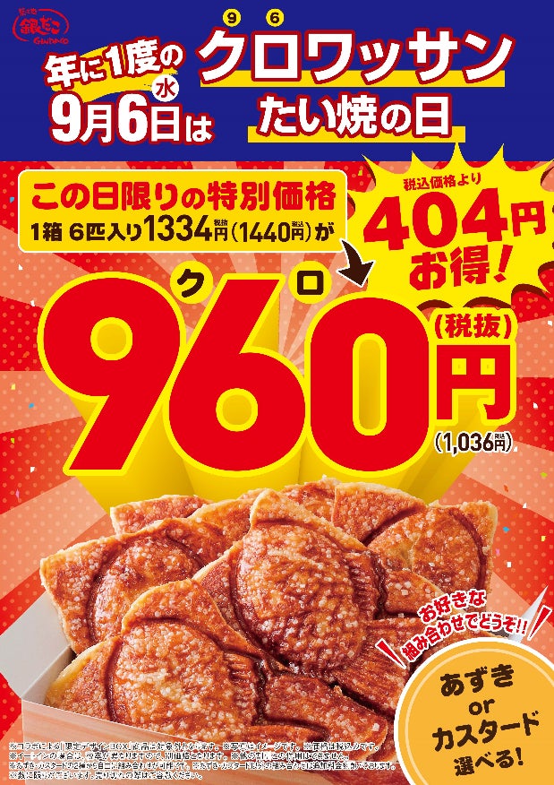 築地銀だこ https://www.gindaco.com/ 銀のあんhttp://www.ginnoan.com/ を展開する株式会社ホットランドhttps://www.hotland.co.jp/(本社:東京都中央区、代表取締役社長:佐瀬守男)は、2023年9月6日(水)、9と6(クロ)=『クロワッサンたい焼の日』を記念し、全国の築地銀だこ・銀のあんのクロワッサンたい焼取扱店(一部店舗除く)で「クロワッサンたい焼6匹入りセット」を、「クロ(96)」にちなみ1箱6匹入り960円(税抜) / 1,036円(税込)の特別価格で販売いたします!