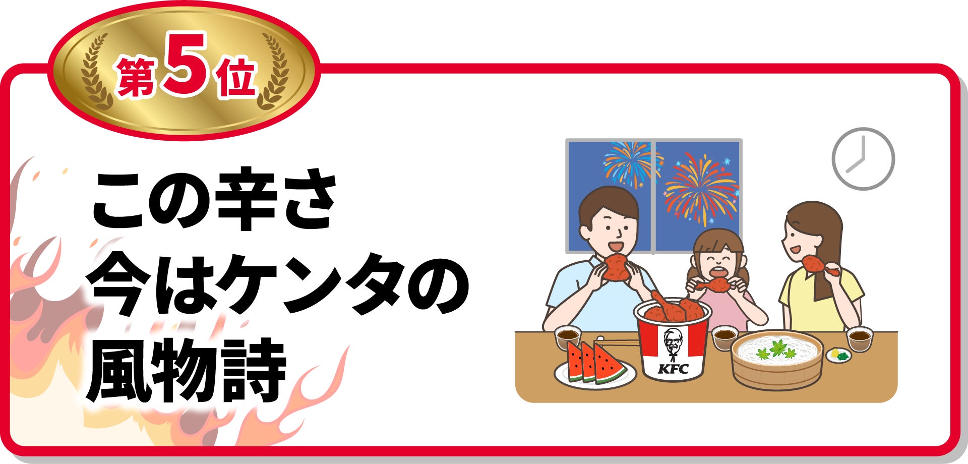 KFC夏の定番商品「レッドホットチキン」は、2004年の発売以降、大変多くの皆さまにご愛顧いただき、今年で20周年を迎えることができました。自社商品への愛着度を高め、より一段高い商品体験をお客さまにお届けするための取り組みとして、KFCグループ内の全従業員を対象とした「祝20周年!レッドホットチキン川柳コンテスト」を実施いたしました。KFC初となる本取り組みには総勢1,067人が参加、寄せられた総数は1,835句に上りました。応募者は「レッドホットチキン」を食べた時、心を込めて調理した時、お客さまに商品をお渡しした時など、それぞれの「レッドホットチキン」にまつわる想い出を、五・七・五の川柳で表現しました。特別審査員には、多数の公募川柳の選者・監修などでご活躍されている川柳作家のやすみ りえさんをお迎えし、厳選の結果、受賞5作品を決定いたしましたのでここに発表いたします。