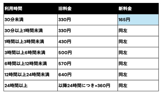 しかし、料金の変更後に「気軽に短時間使用できるプランが欲しい」という要望を想定以上にいただいたほか、最近の物価上昇に起因する多くのユーザー(特に若年層)のニーズに応え、30分未満165円の利用料金を再設定することにいたしました。