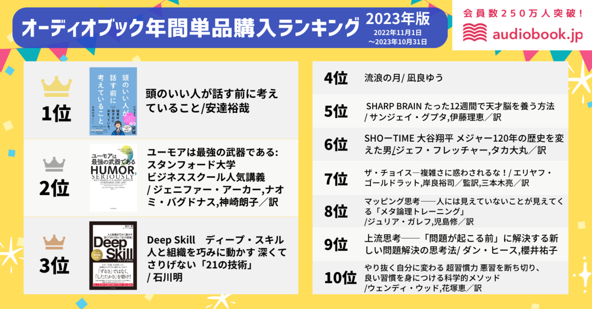 「audiobook.jp」オーディオブック年間ランキング2023発表!『頭のいい人が話す前に考えていること』が1位