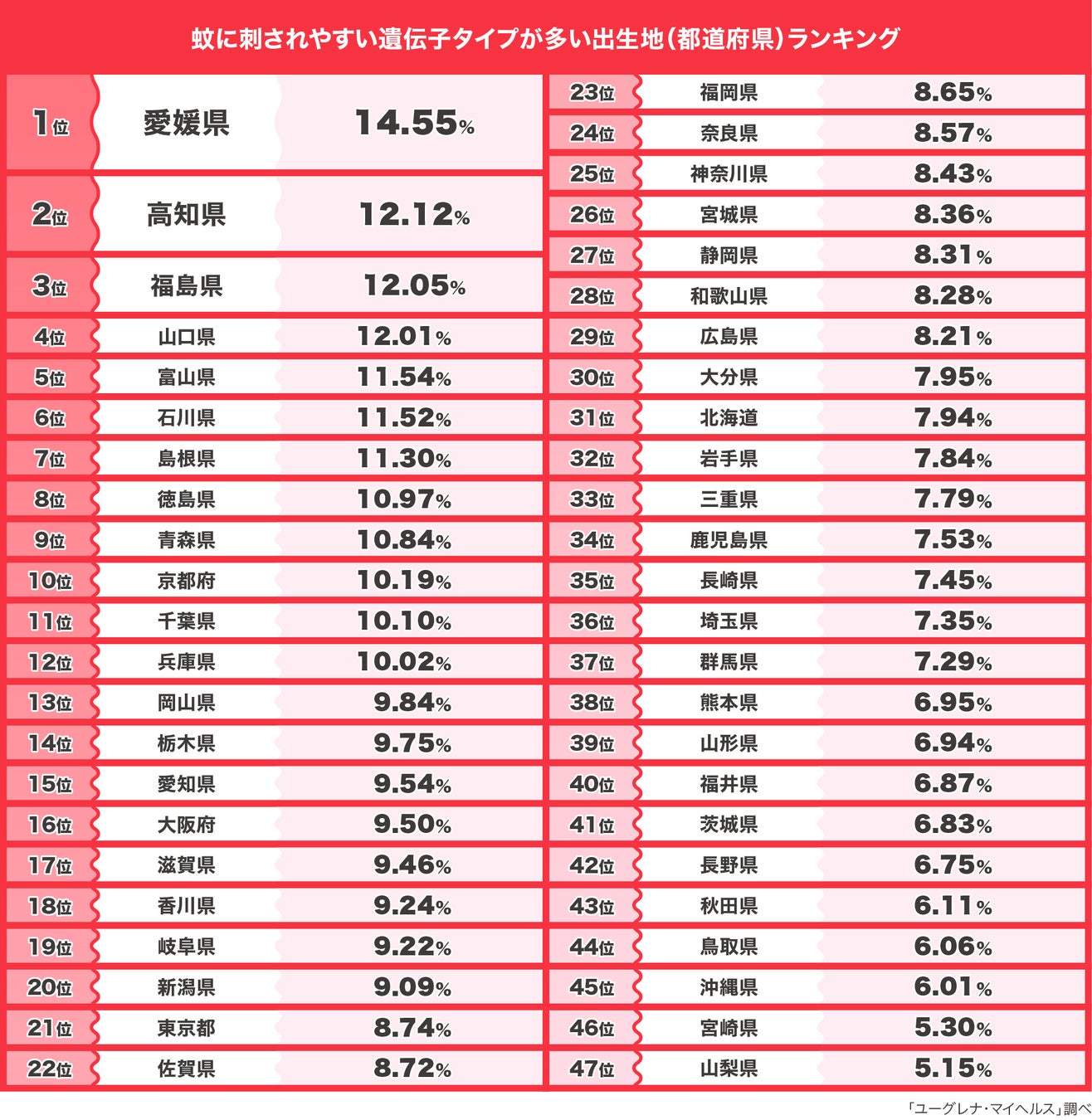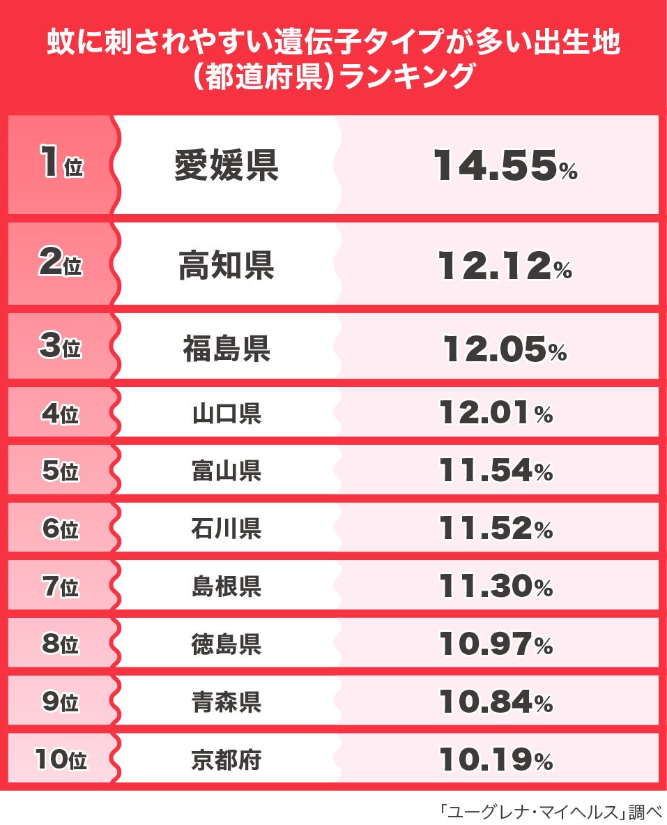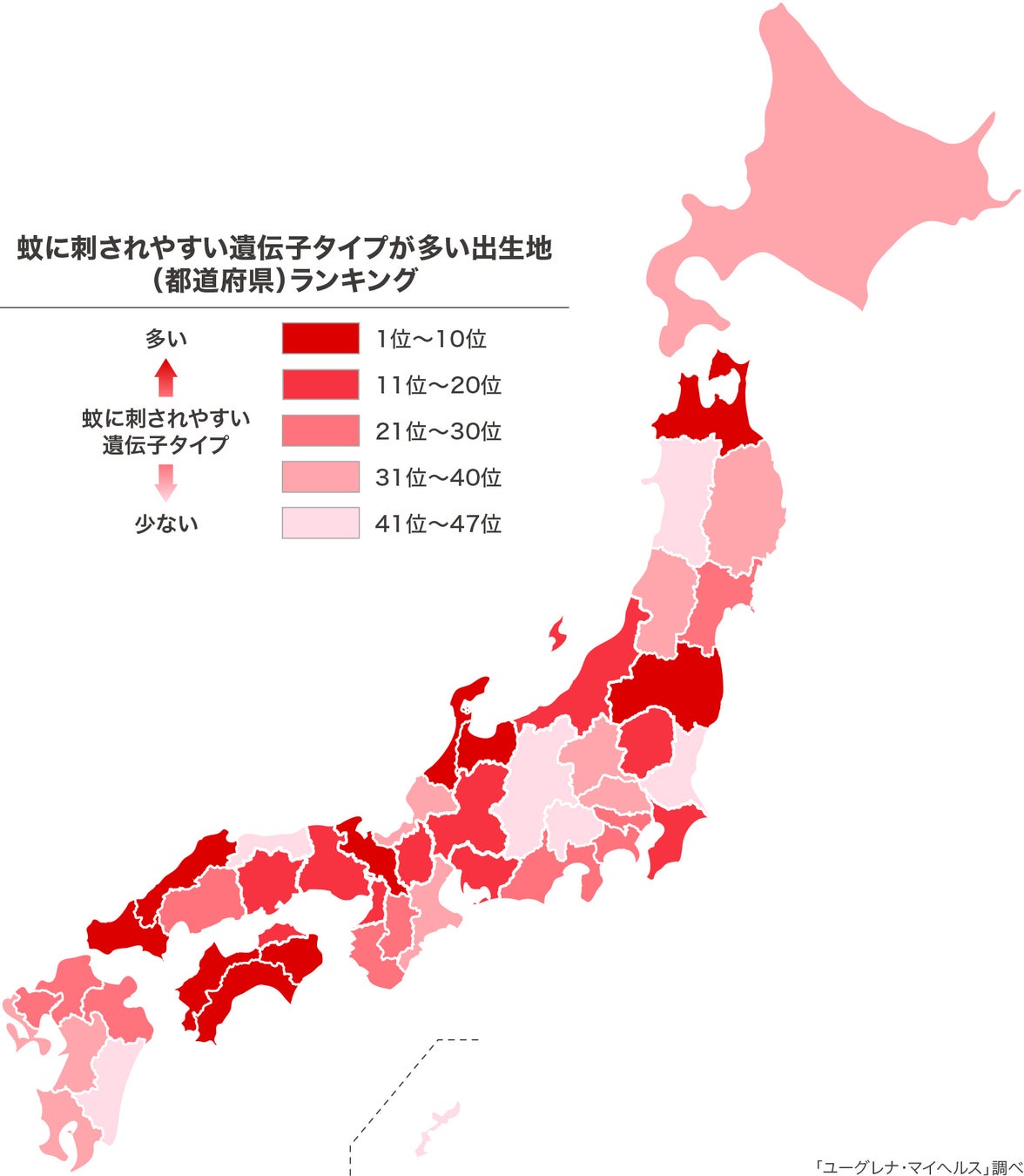 蚊に刺されやすい遺伝子タイプが多い出生地(都道府県)ランキング発表!中四国で多い傾向に 第1位は「愛媛県」出身で、血液型はO型