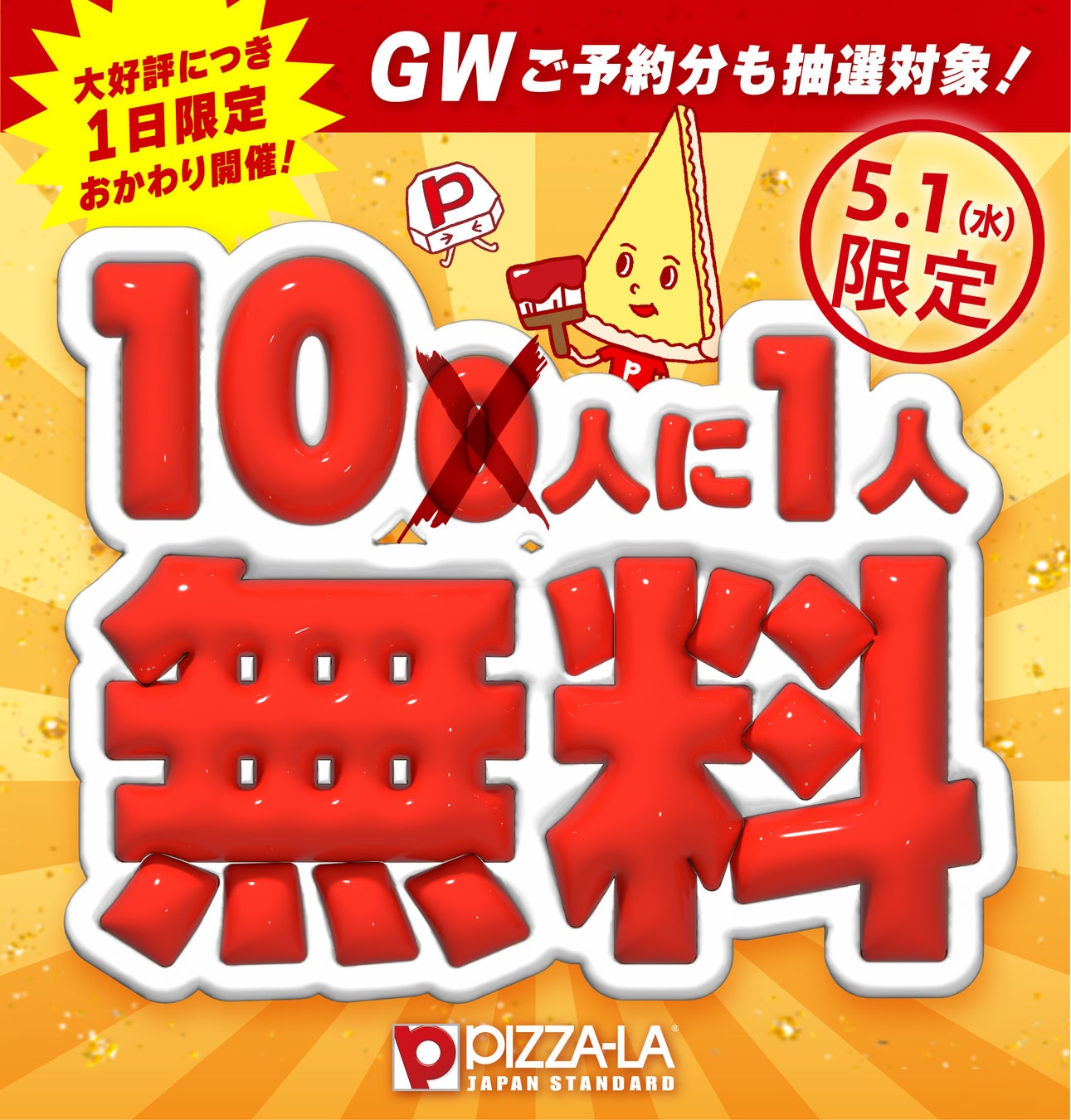 現在開催中の『ピザーラ創業祭』(3月28日~5月12日)で、創業日限定(4月17日)で実施しました「10人に1人無料」キャンペーンが、ゴールデンウィークの特別企画として5月1日(水)限定で復活します。