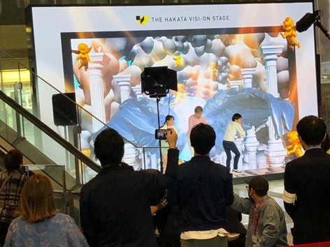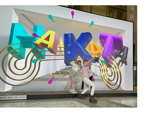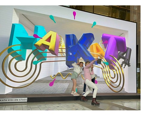 博多の名産品、明太子や豚骨ラーメンなど“博多っぽいもの”が立体映像でビジョンから飛び出してきたり、縦横無尽にビジョンを漂っていたりしている中、HAKATAのオブジェクトが立体映像で登場し、観光で博多を訪れた方が記念に写真を撮って「博多についたー!」と実感していただけるコンテンツとなっております。