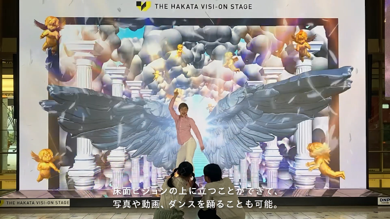 天使が息を吹きかけると巨大な天使の羽が出現し、大型ビジョンに乗って画面の真ん中に行くと、羽が生えたような映える写真が撮影できます。