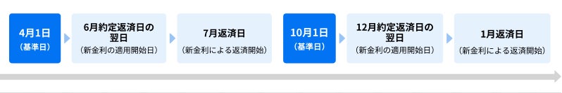 基準日が4月1日の場合は7月約定返済分から、10月1日の場合は翌年1月約定返済分から 新しい借入利率で計算した利息となります。