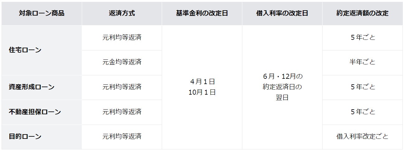 次回の金利を決定する基準日である2024年10月1日(火)時点の基準金利とお借入れいただいている各種ローンの基準金利を比較し、変動している場合は、2025年1月より新しい借入利率で計算された約定返済額でのご返済となります。
