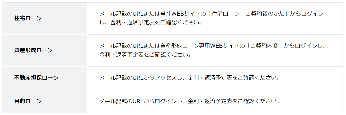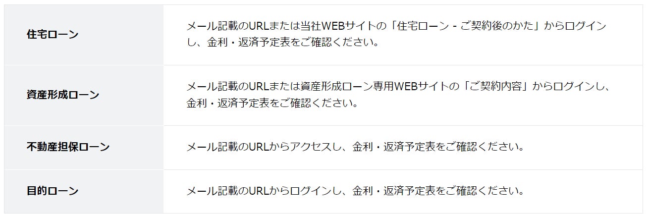 今回のローン金利改定以降の返済予定額のお知らせは、2024年10月1日(火)より順次、メール・アプリでのお知らせなど、以下のとおりご案内予定です。詳しくは、ご案内をご確認ください。