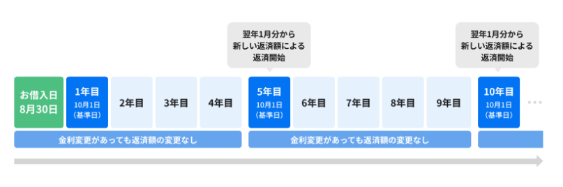 ただし、お借入れ後5回目の10月1日を基準とする基準金利の改定日まで約定返済額は変更されず、 約定返済額に占める元金と利息の内訳が変更されます。