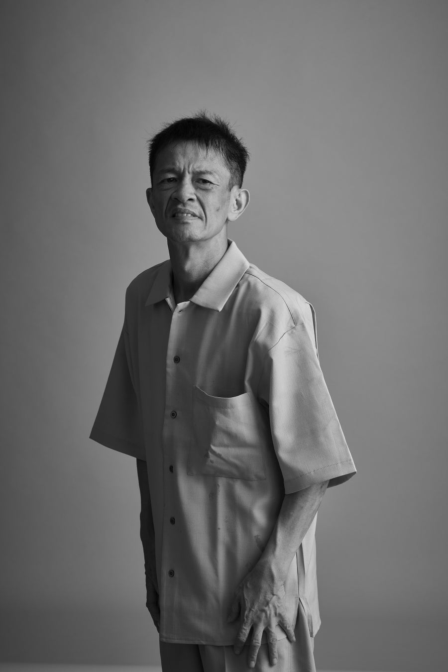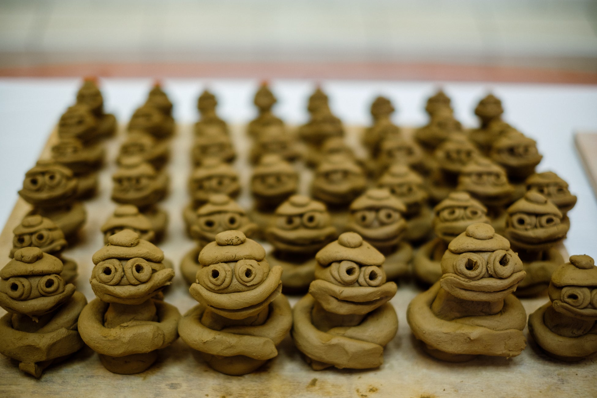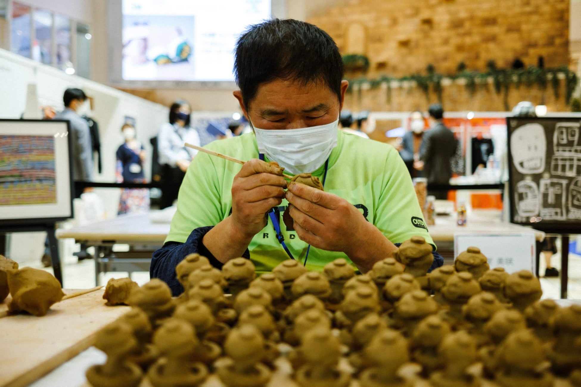 1972年生まれ 滋賀県在住 1990年から『やまなみ工房』に所属 炊事、洗濯、部屋掃除に 古紙回収、毎日彼が同じ時間、同じ流れで生活する中のひとつに創作活動がある。入所当初 は、学校時代に学んだ皿や器等しか作ることのできなかった彼が、様々な体験や共に過ごす 仲間からの影響を受け、次第に作品も個性豊かな立体造形へと進化していった。彼の真面目 で実直な性格は作風にも表れ、同じ形の物を止めることなく、まるで流れ作業のように量産 して作りつづけることができる。彼の代表的な作品「正己地蔵」もこれまで20年以上変わ ることなく制作され、何十万体を超える作品は、彼の生き様そのものなのである。
