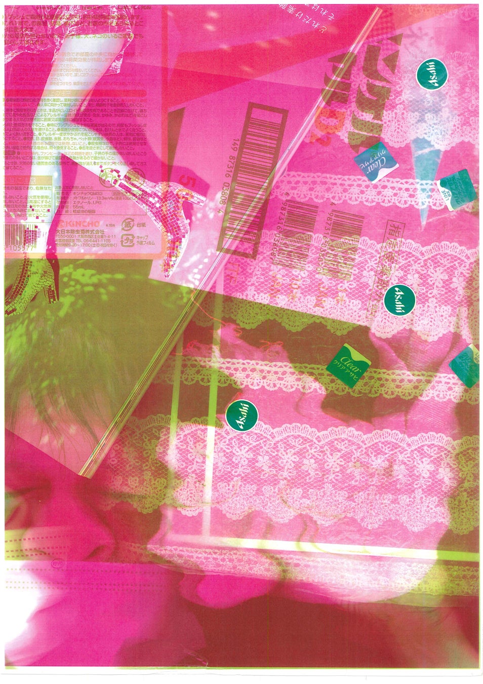 街のコンビニと施設のコピー機を使って、自分の顔とその時々の気に入ったものを写し取る ことを毎日の日課としている。 ガラス面に顔を押し付け自分でボタン操作し、センサー光の動きと共に身体を動かすこと で、画面に独特の歪みを作り出す。作品中に多用されるシールは、施設でのアルミ缶作業中 に剥がした景品応募シールで、これまで何度も当選している。 近所のコンビニには20年あまり毎日通っており、終わると店員が手際よくガラス面についた 顔の脂を拭いてくれる。