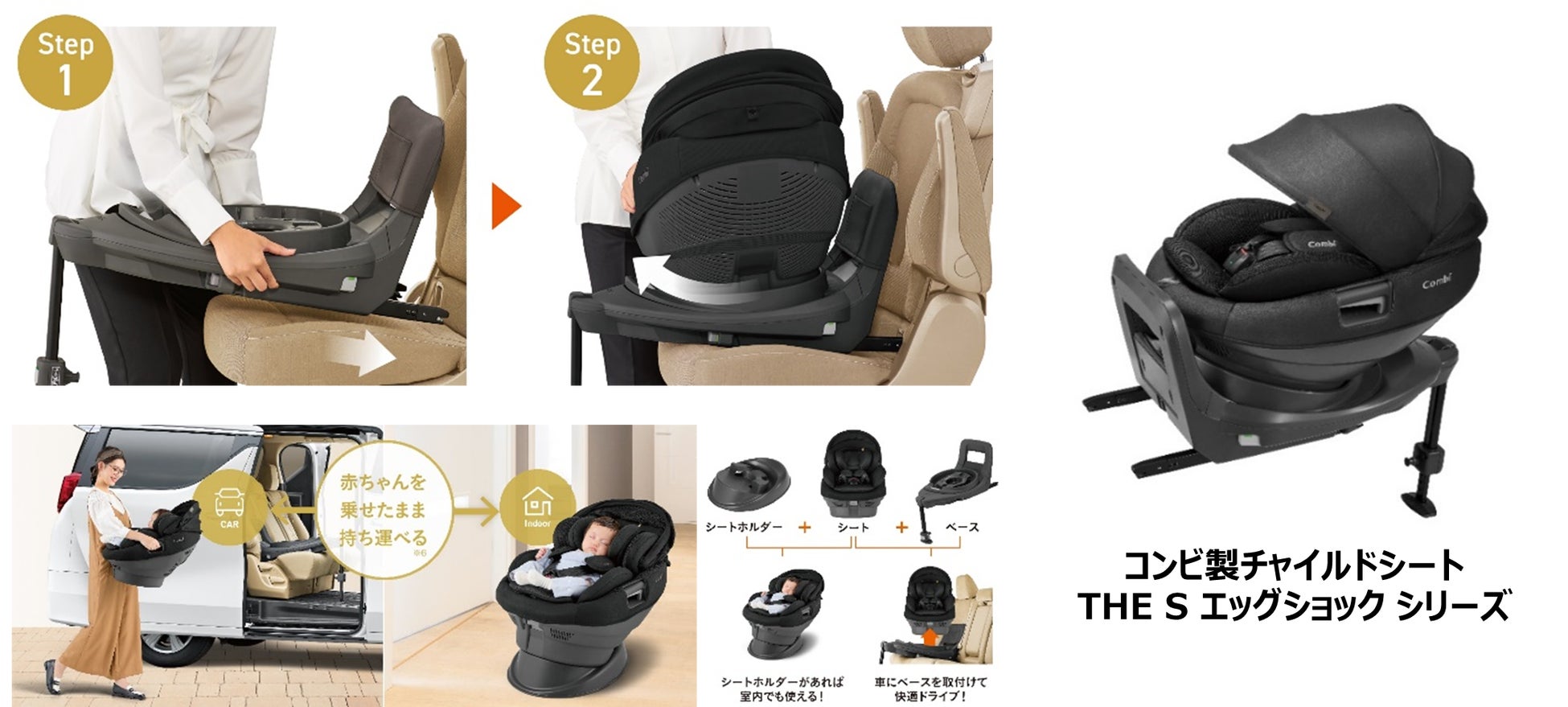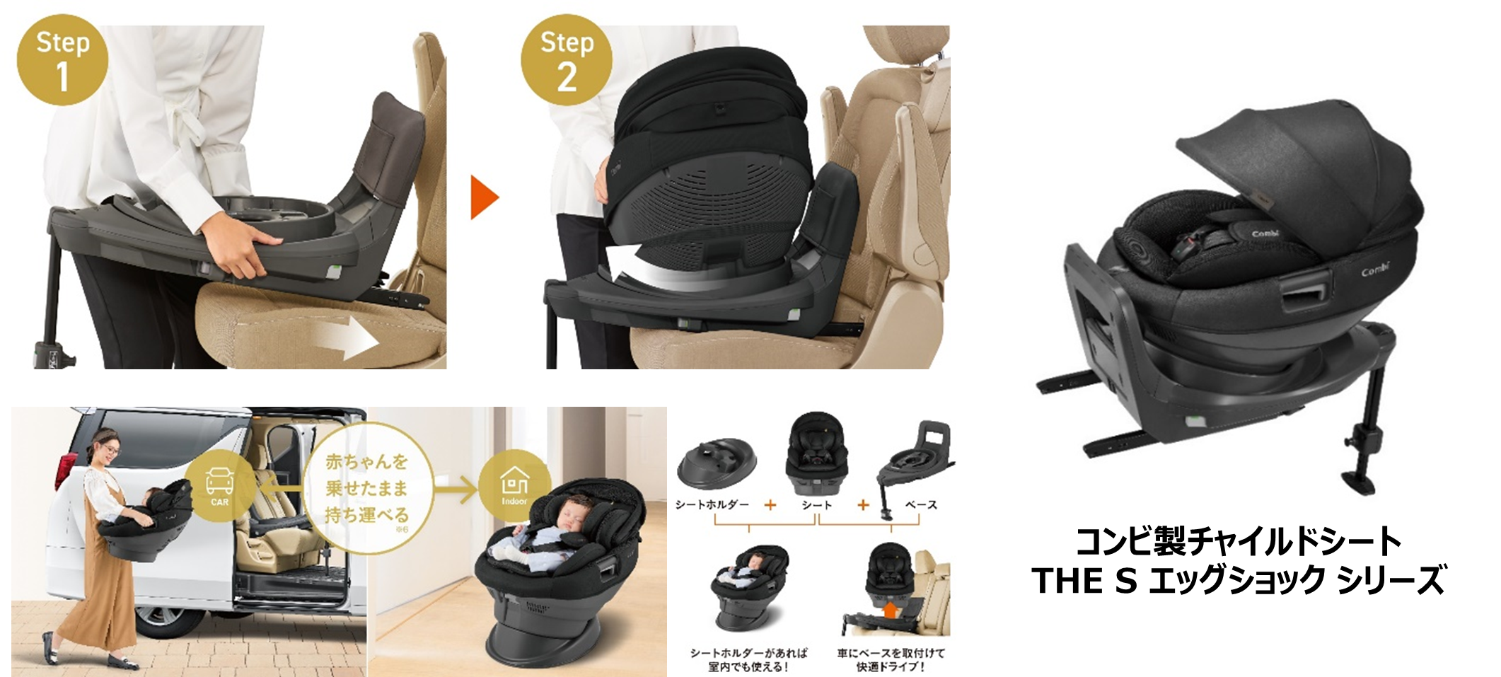 また、赤ちゃんを乗せるシートを回転させてレバーを握るだけで、車に取り付けるベース部とシート部が分かれる“セパレート構造”なので、外出中に眠った赤ちゃんをシートに乗せたまま、車から宿泊先の室内への移動が実現します。(※) さらに、シート頭部の両側面には、卵を落としても割れないほどの超・衝撃吸収素材「エッグショック」を搭載し、衝撃や振動から赤ちゃんの頭をしっかり守ります。
