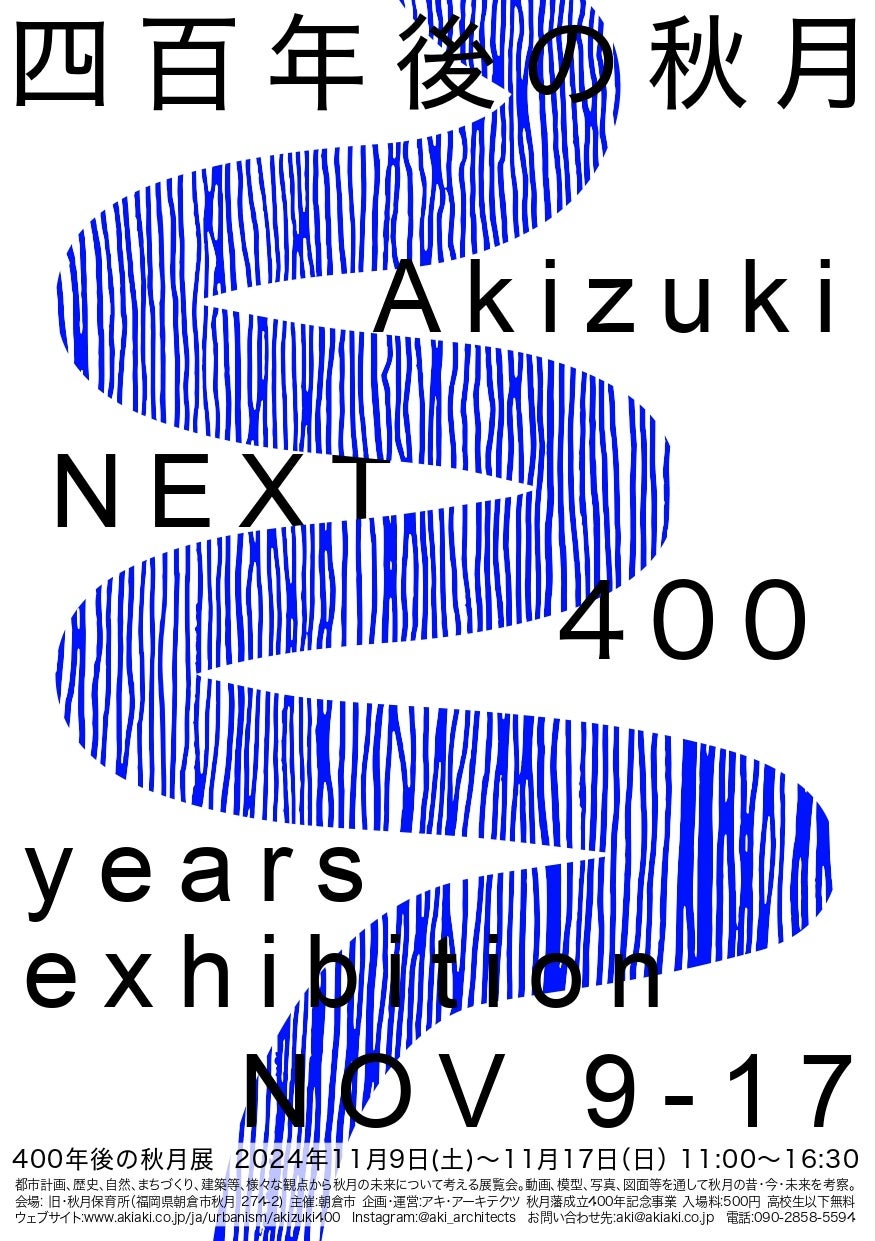 秋月藩成立400年を記念として、秋月藩成立の時代からの歴史を辿り、未来の秋月を考える展覧会。地図、図面、模型、動画や写真を通しての秋月の都市計画、建築、環境、石垣などを体験するだけでなく、職人、まちづくりの専門家、建築家、 歴史研究家、大学教授、学生、住民などが一緒となって考えた秋月の未来予想図が展開されます。