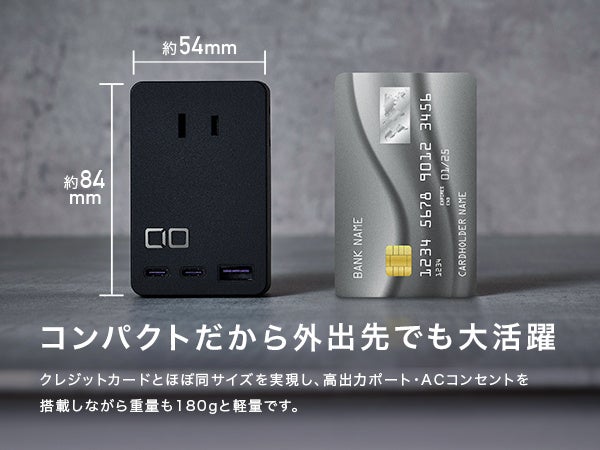 クレジットカードとほぼ同サイズの54mm×84mm×38mmを実現し、高出力ポート・ACコンセントを搭載しながら重量も約180gと軽量です。