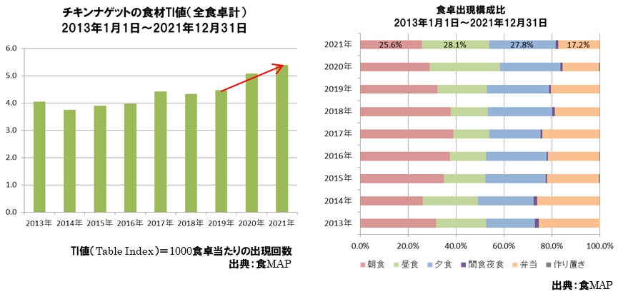 コロナ下の即食・簡便ニーズを受けて、チキンナゲットの食卓出現頻度はここ数年伸長しています(グラフ「チキンナゲットの食材TI値」参照)。