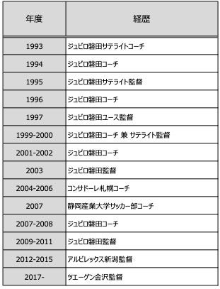 ジュビロ磐田サテライトコーチ - ジュビロ磐田コーチ - ジュビロ磐田サテライト監督 - ジュビロ磐田コーチ - ジュビロ磐田ユース監督 - ジュビロ磐田コーチ兼サテライト監督 - ジュビロ磐田コーチ - ジュビロ磐田監督 - コンサドーレ札幌コーチ - 静岡産業大学サッカー部コーチ - ジュビロ磐田コーチ - ジュビロ磐田監督 - アルビレックス新潟監督 - ツエーゲン金沢監督
