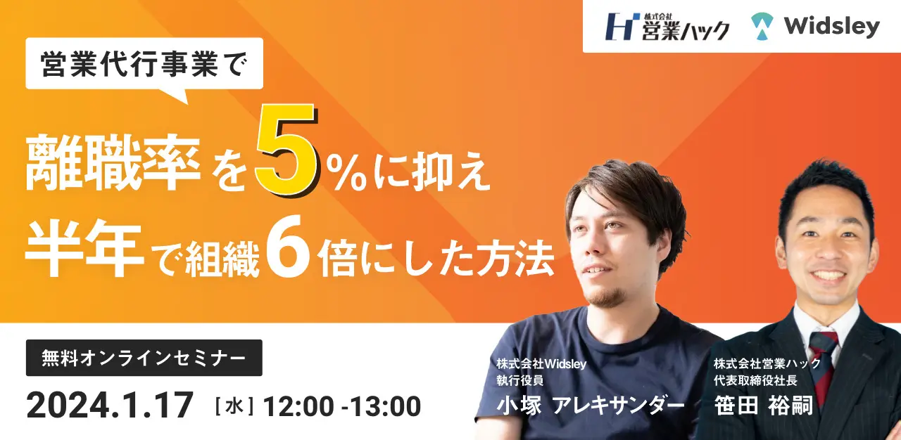 今回は、株式会社Widsleyの小塚アレキサンダー様と、株式会社営業ハックの代表笹田による共催セミナーです!テーマは「営業代行事業での組織拡大に重要なこと」。