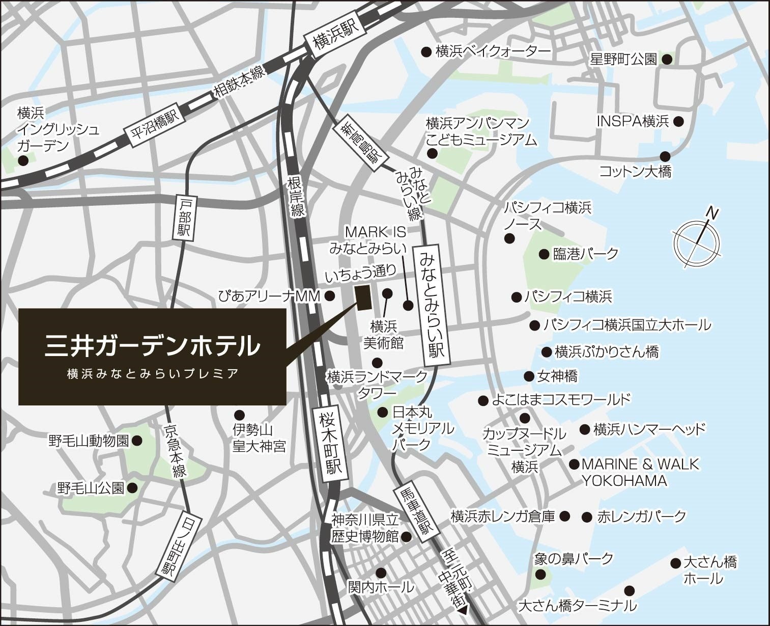 当ホテルは、横浜高速鉄道みなとみらい線「みなとみらい」駅から徒歩約5分、JR根岸線「桜木町」駅から徒歩約10分と交通利便性に優れており、横浜を代表する観光スポットの「横浜赤レンガ倉庫」(※2)や、「パシフィコ横浜」といった大規模複合施設からほど近い立地であることから、レジャーやビジネスの活動拠点としてご利用いただけます。