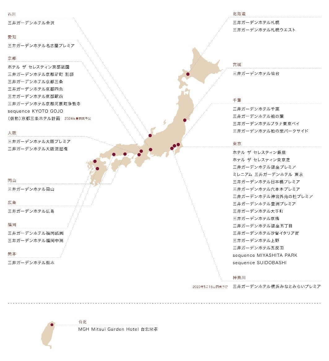 三井不動産ホテルマネジメントは、現在、アッパーミドルクラスの宿泊主体型ホテルである「三井ガーデンホテルズ」を34ホテル(8,919室)、ハイクラスの宿泊主体型ホテルである「ザ セレスティンホテルズ」を3ホテル(504室)、“次世代型”新ホテルブランド『sequence(シークエンス)』を3ホテル(567室)、合計40ホテル・9,990室運営しています。今後も「記憶に残るホテル」「感性豊かなお客さまの五感を満たすホテル」という理念・コンセプトのもと、ホスピタリティ溢れるサービスを提供してまいります。