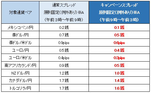 ※キャンペーンスプレッドの提示時間帯はすべて対象期間中の各営業日の午前9時~翌午前3時。同期間中の通常スプレッドは各営業日の午前3時~午前9時に提示。