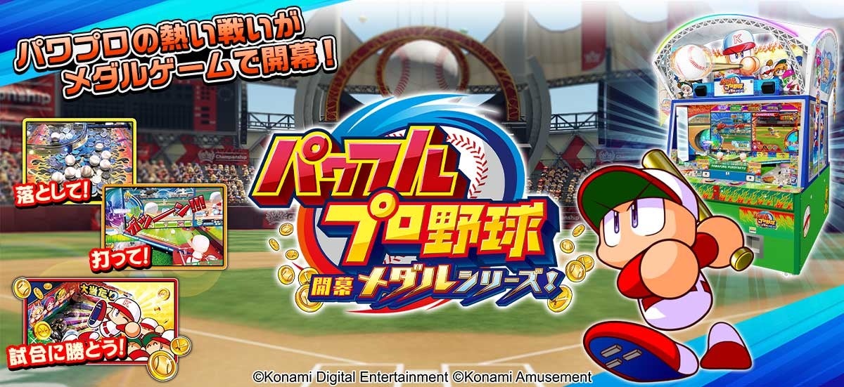 『パワフルプロ野球 開幕メダルシリーズ!』は、「パワプロ」のキャラクターたちと試合を行い、勝利を目指すメダルプッシャーゲームです。