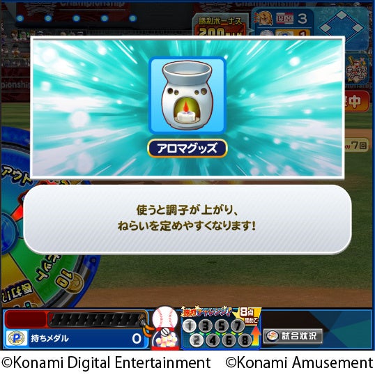「アロマグッズ」を使用すると、物理抽選「バッティング抽選」を行っている間、モニターに映し出されるスクロールがゆっくり動きます。そのため、野球ボールが当たりやすくなり、「チャンス!」もしくは「大チャンス!」を狙いやすくなります。