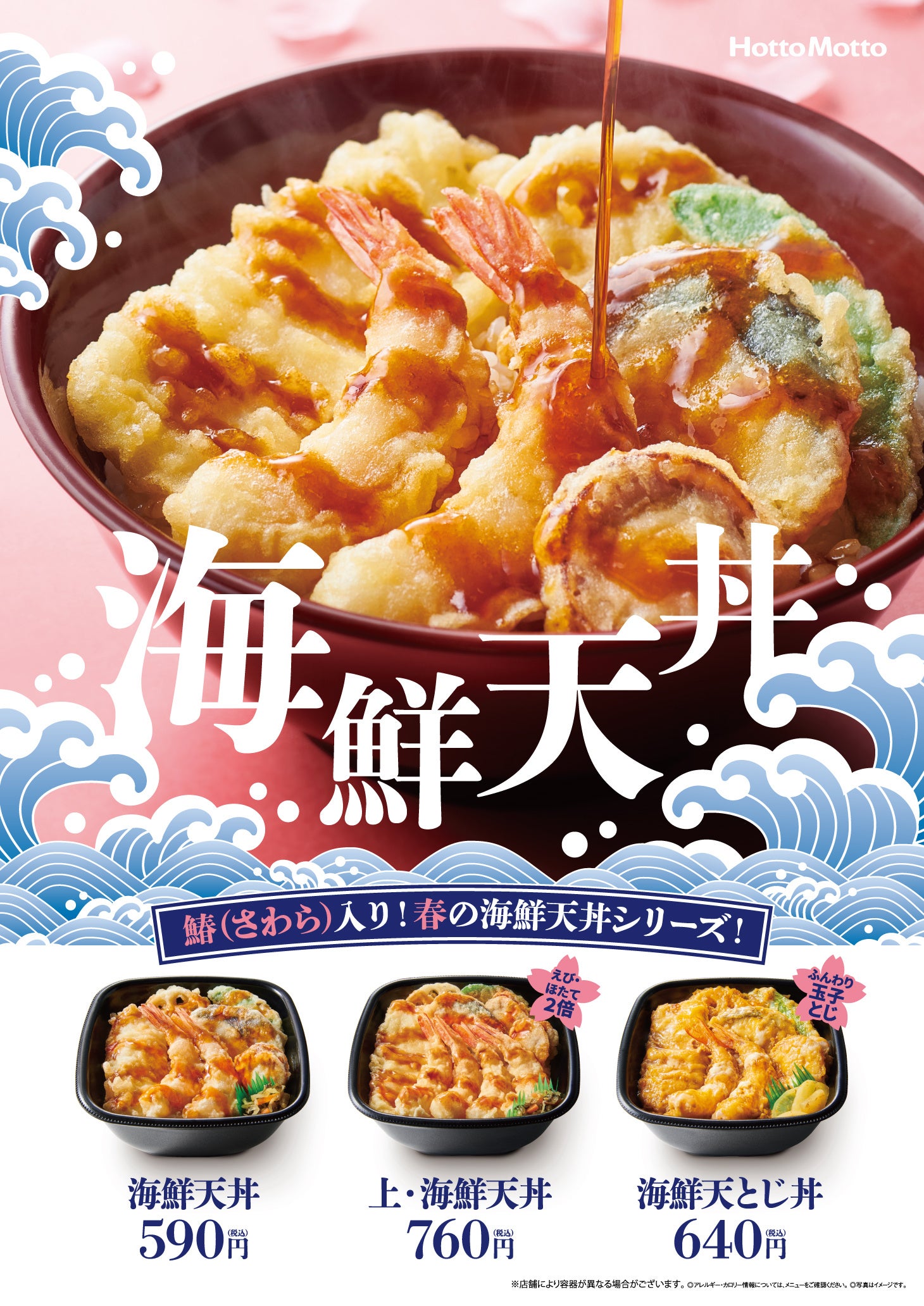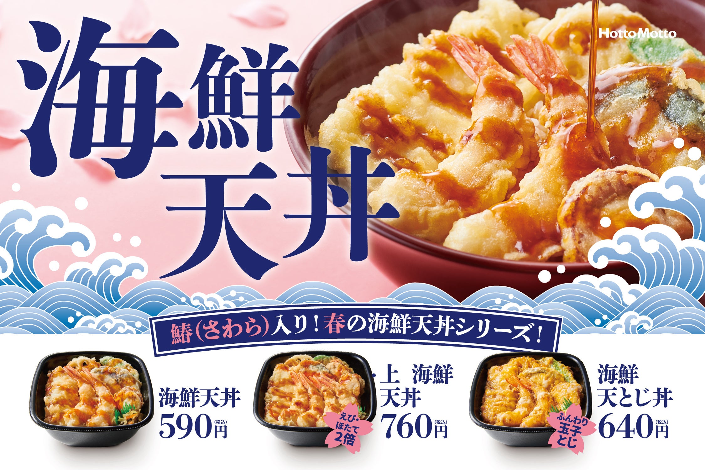 「ほっともっと」春の定番商品を今年も販売! 春らしい鰆(さわら)やエビ・イカ・ホタテ、海鮮の天ぷらを贅沢に 『海鮮天丼』590円 3月10日(金)より全国で発売