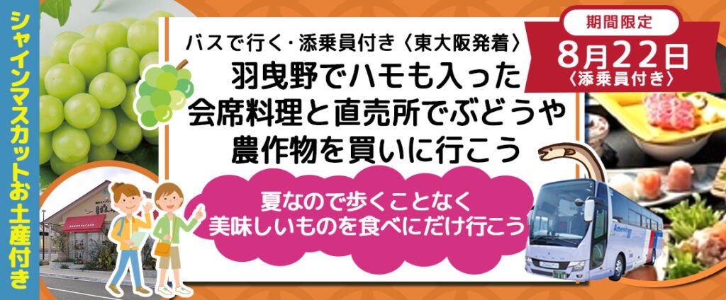 ※ツアー催行決定※《シャインマスカットお土産付》8月22日(火) 【大阪府】〈東大阪発着・添乗員付き〉 羽曳野でハモも入った会席料理と直売所でぶどうや農作物を買いに行こう バスで行く 『夏なので歩くことなく美味しいものを食べにだけ行こう』