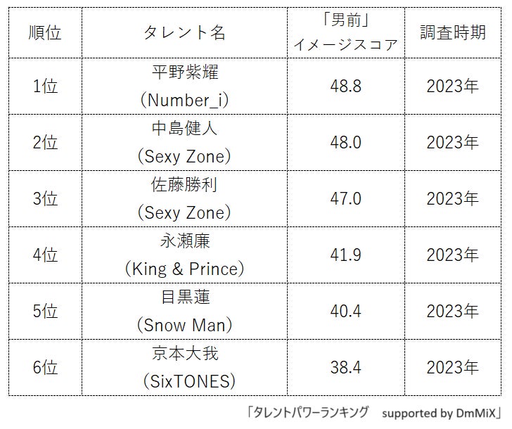 『タレントパワーランキング』では、タレントパワーランキングに登録されている「男前」なイメージを持たれている、グループに所属している20代男性タレントのスコアを調査。