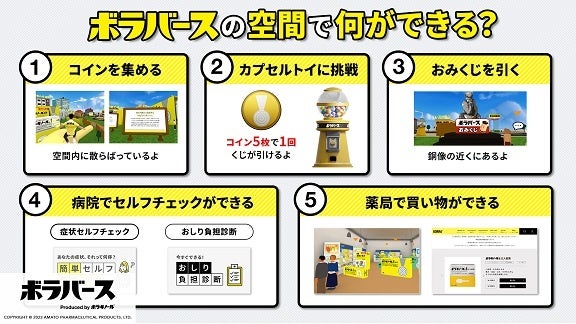 利用者は自分のアバターを選び、「ボラギノール広場」「ドラッグストア」「病院」「家」「工場」「歴史博物館」で構成したエリアを自由に移動してパネルや動画等を閲覧、視聴できます。「病院」では、ブランドWebサイトで提供中の「セルフチェック」を体験できます。また、複数設置したパネルをタッチすることでコインを集めて、カプセルトイで利用できるなど楽しみながら商品の特長や魅力、天藤製薬の取り組みがわかる仕掛けになっています。