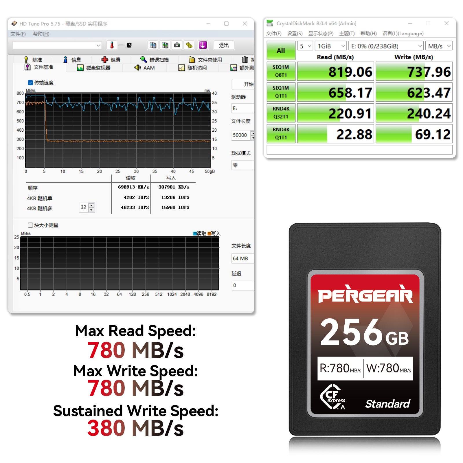 256GBの最大読込、書込速度は780MB/s、最低限持続書込速度300MB/sとなります。