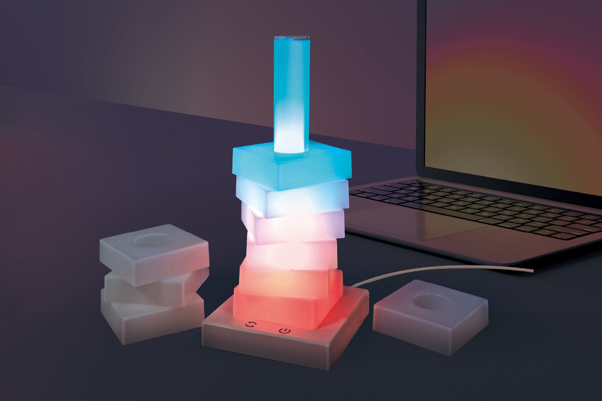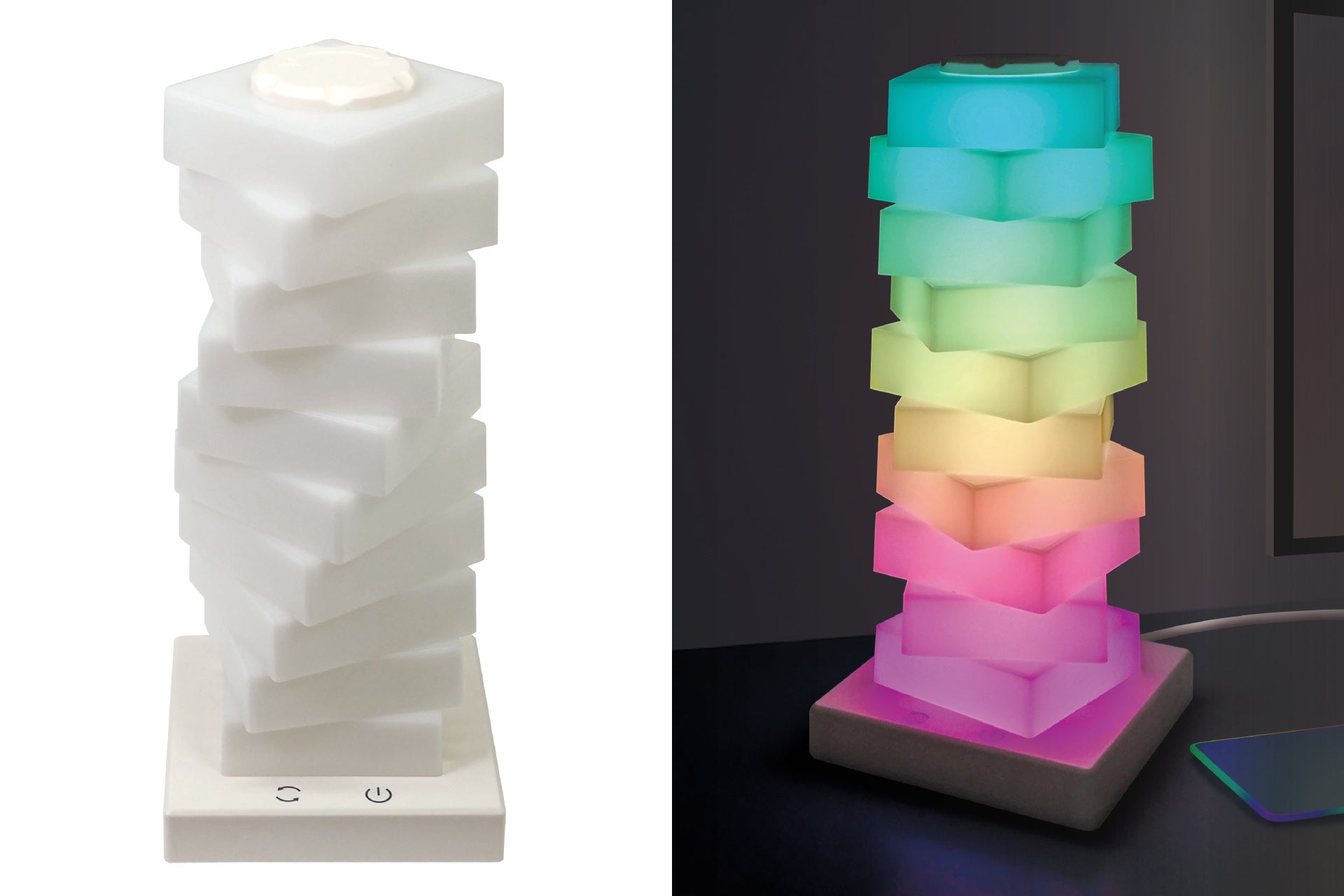 特徴:幻想的なレインボーカラーが美しく広がる、タワー型デザインのライト。点灯すると色とりどりの光が縦に重なり、空間を華やかでムーディーな雰囲気に演出します。ブロックになっているので着脱・組み替え可能、自由に組んでお好みの光のタワーに!置くだけで存在感があり、リビングやベッドサイド、デスク周りのアクセントにもぴったり。